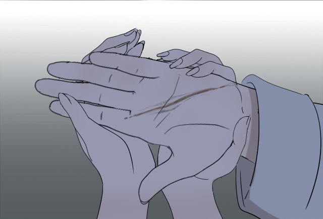 ‘Give!’ says Xu Youyi again. Impatiently, she reaches under the covers and draws out Yan Wei’s hand. There’s a scar across the palm.