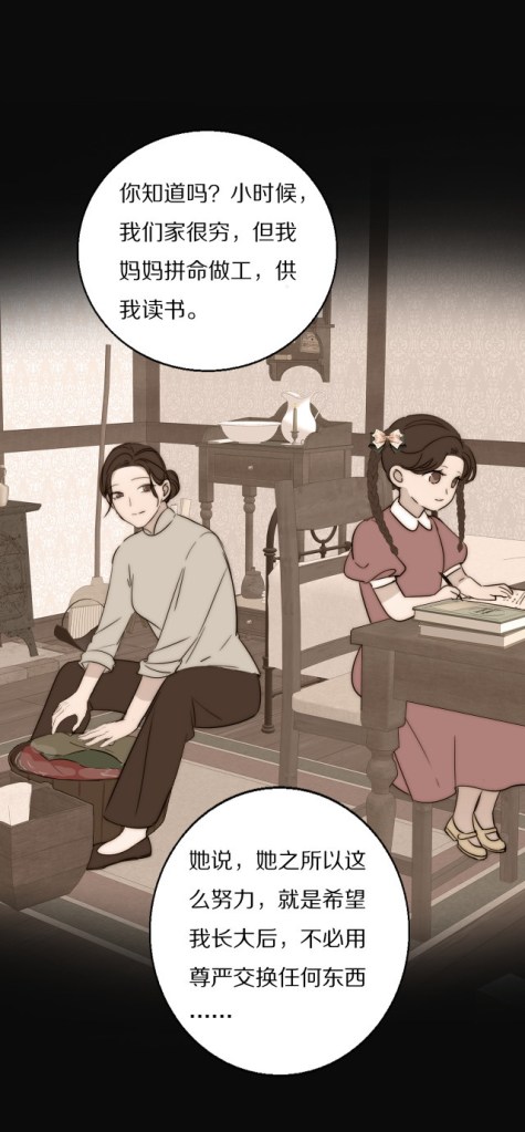 ‘Did you know?’ she asks. ‘When I was little, my family were very poor, but my mother worked her fingers to the bone so that she could pay for me to go to school. She always said, the reason she worked so hard was to make sure that, once I grew up, I would never need to trade away my dignity.’