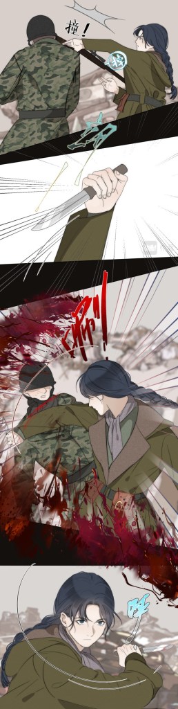 Yan Wei knocks an enemy soldier on the head with the butt of her rifle, then pulls out a knife and cuts his throat.