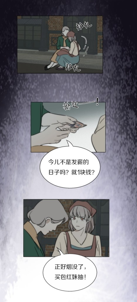 We get a flashback to Hongmei’s mother, wrestling money out of her own daughter’s hands. ‘Isn’t it payday today?’ she demands. ‘One yuan? Is that all you have? Fine, I’m out of cigarettes anyway. This will be enough for a pack of Hongmei.’