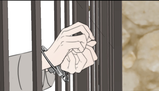 After a moment, Yan Wei reaches through the bars of her cell, and Xu Youyi takes Yan Wei’s hands in her own.