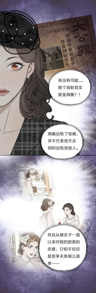 Then Xu Youyi has a sudden realisation. She flashes back to the newspaper article about Chu Huizi’s secret rendezvous with a mystery man, and the photograph that accompanied it. Could that man be Zhou Heng, after all? Just because he was having an affair with Zhang Wan doesn’t mean he wasn’t having an affair with anyone else. She flashes back to her previous encounters with Chu Huizi. Chu Huizi was always so hostile towards me. I’m sure now that it wasn’t just because of the professional rivalry between us.