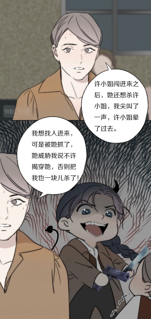 ‘When Miss Xu came into the room, she wanted to kill Miss Xu as well,’ Mrs Zhu elaborates. ‘I screamed, and Miss Xu fainted. I wanted to look for help, but she grabbed hold of me and threatened me! She said if I told anyone that she was the murderer, she’d kill me too!’ She conjures up an image of Yan Wei — with devil’s horns, no less — threatening her gleefully.