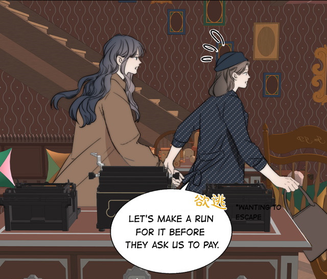 She grabs hold of Yan Wei’s hand and starts leading her towards the exit. ‘Let’s make a run for it before they ask us to pay.’