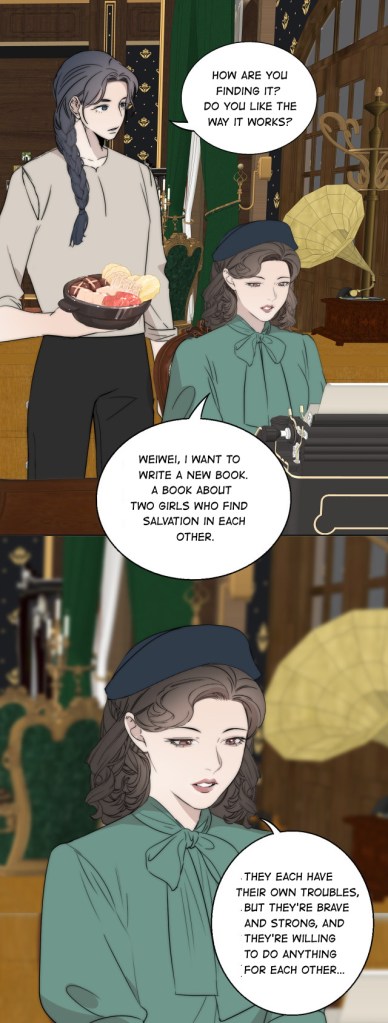 Xu Youyi doesn’t reply directly. ‘Weiwei,’ she says. ‘I want to write a new book. A book about two girls who find salvation in each other. They each have their own troubles, but they’re brave and strong, and they’re willing to do anything for each other…’