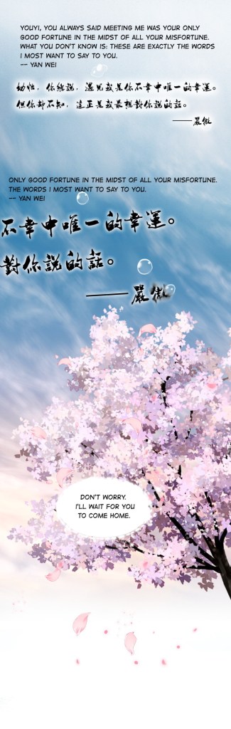 The last part of the letter reads: Youyi, you always said meeting me was your only good fortune in the midst of all your misfortune. What you don’t know is: these are the exact words I’ve most wanted to say to you.